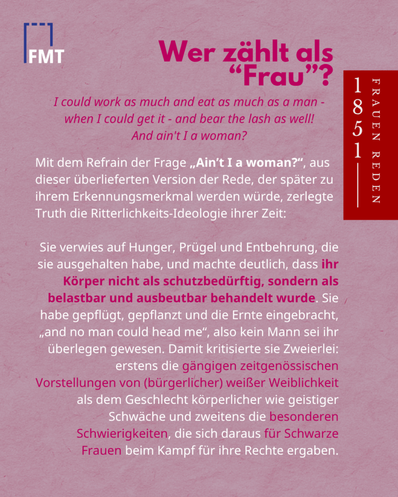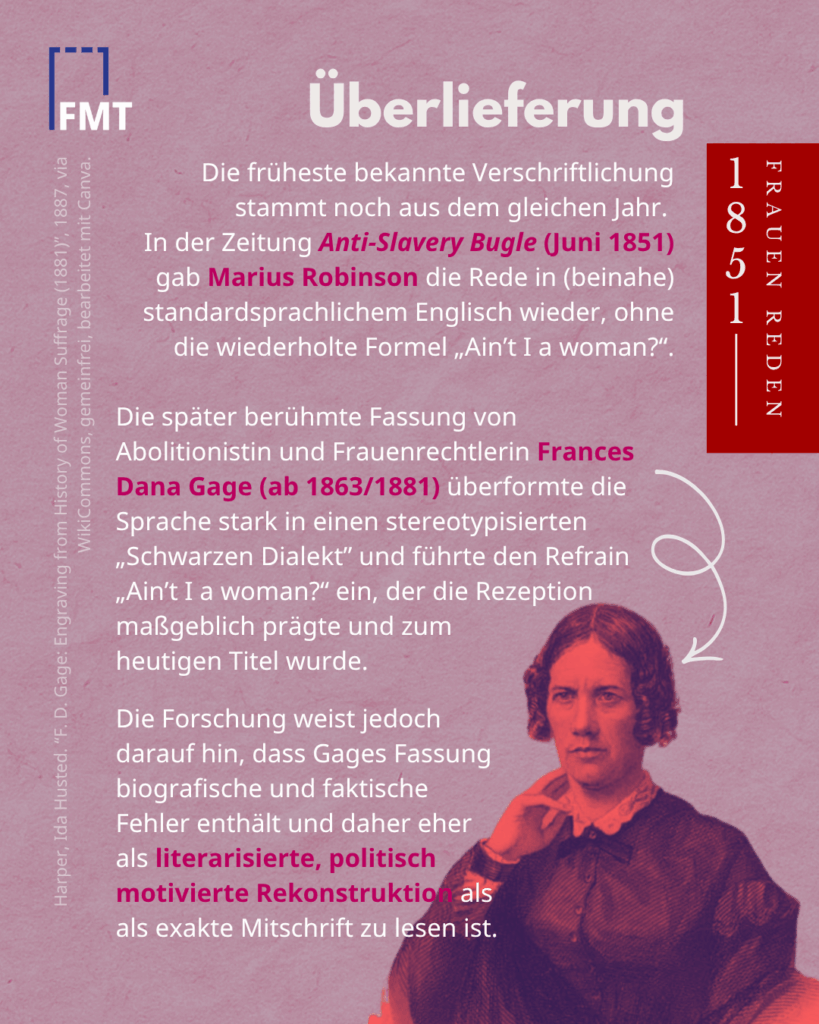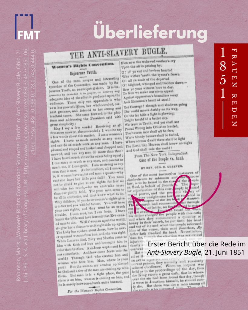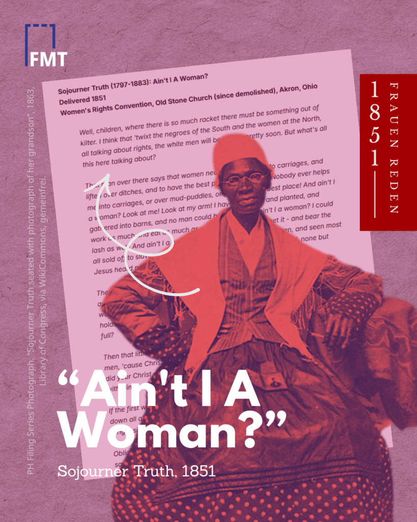 *Die heute berühmte Version mit dem Refrain „Ain’t I a woman?“ entstand erst Jahrzehnte später, als die weiße Aktivistin Frances Dana Gage den Text in einen stereotypisierten „Schwarzen Dialekt“ uminterpretierte.