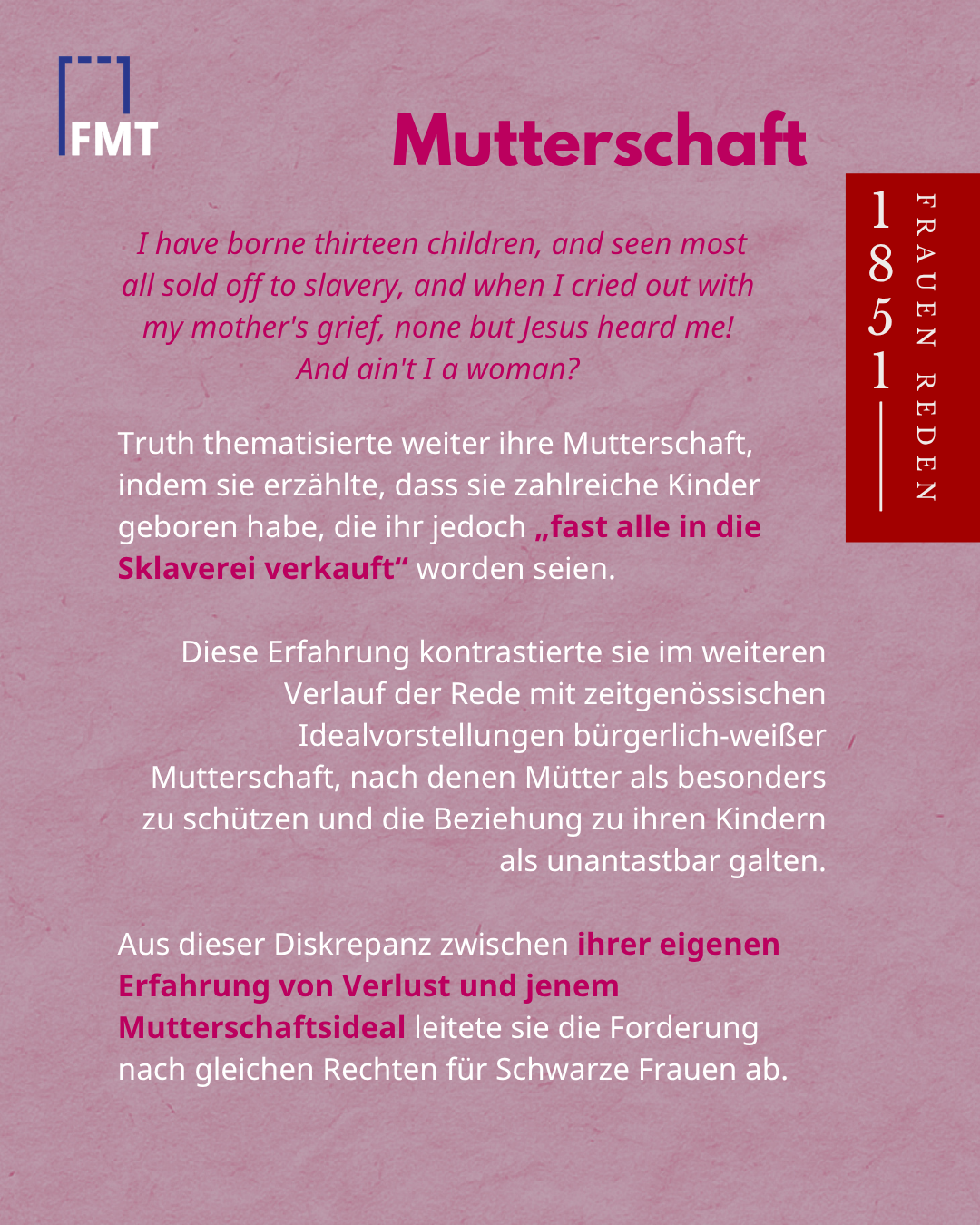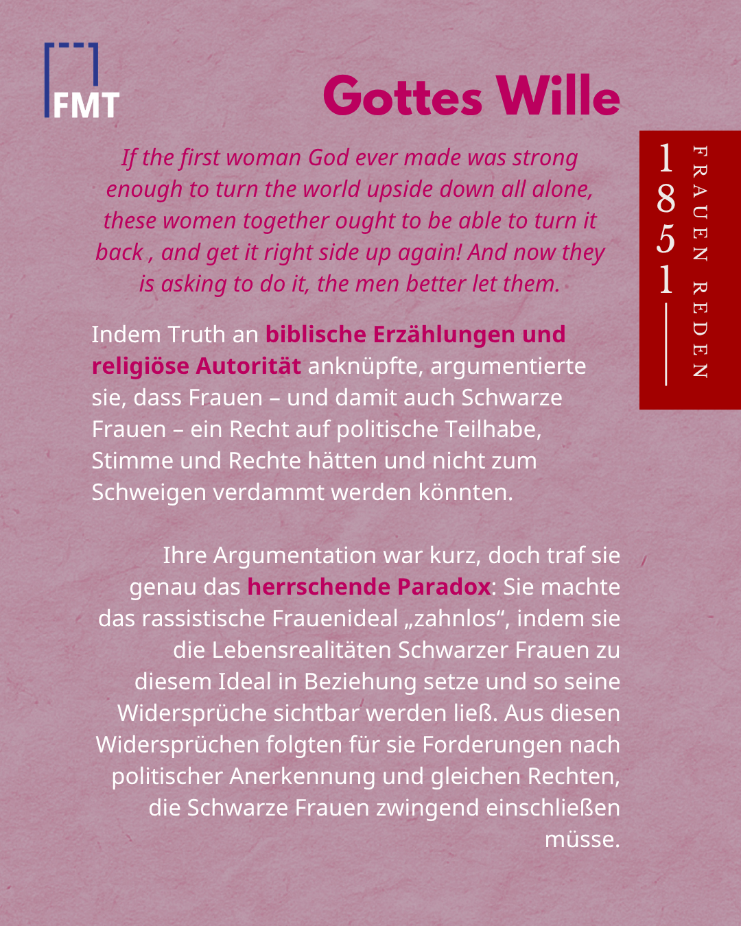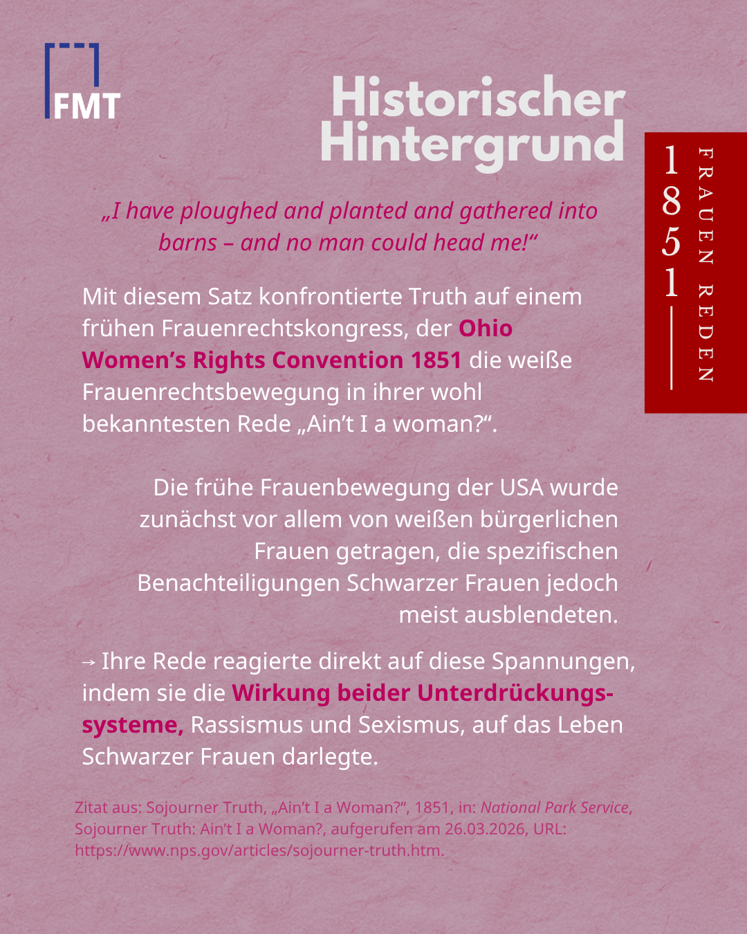 *Die heute berühmte Version mit dem Refrain „Ain’t I a woman?“ entstand erst Jahrzehnte später, als die weiße Aktivistin Frances Dana Gage den Text in einen stereotypisierten „Schwarzen Dialekt“ uminterpretierte.