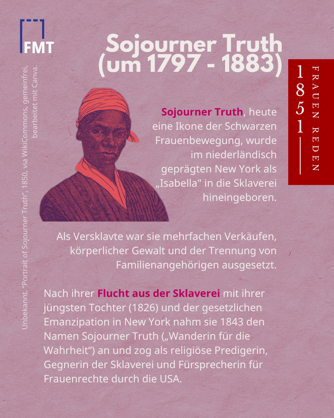 Truth, Ikone der Schwarzen Frauenbewegung, wurde als „Isabella“ in die Sklaverei geboren. Sie erfuhr Verkäufe, Gewalt und Familientrennungen. Nach ihrer Flucht aus der Sklaverei (1826) und der gesetzlichen Emanzipation nahm sie 1843 den Namen Sojourner Truth an und zog als religiöse Predigerin, Abolitionistin und Frauenrechtlerin durch die USA.