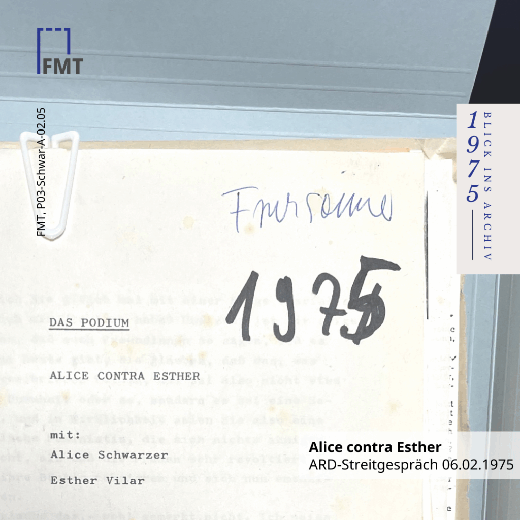 • Fundstelle: Manuskript der Sendung „Alice contra Esther“, 6.2.1975, ARD, FMT, PO3-Schwar-A-02.05; Fundstelle des Sendungsmitschnitts: FI.01.011