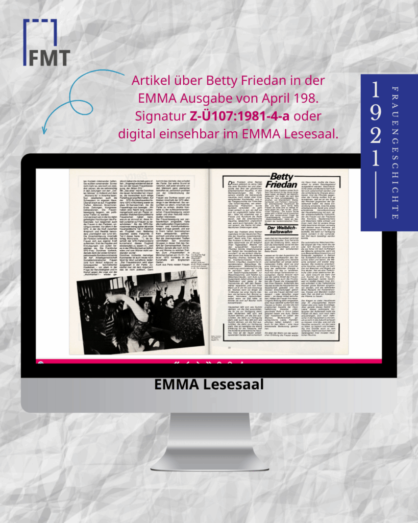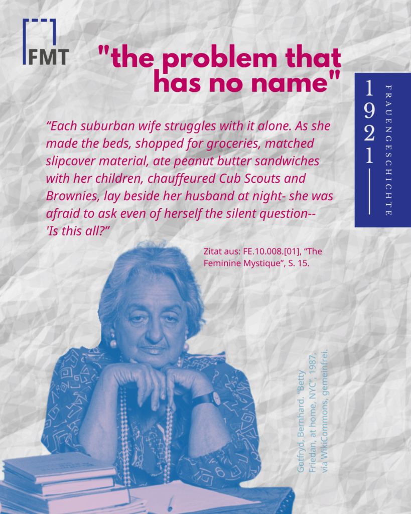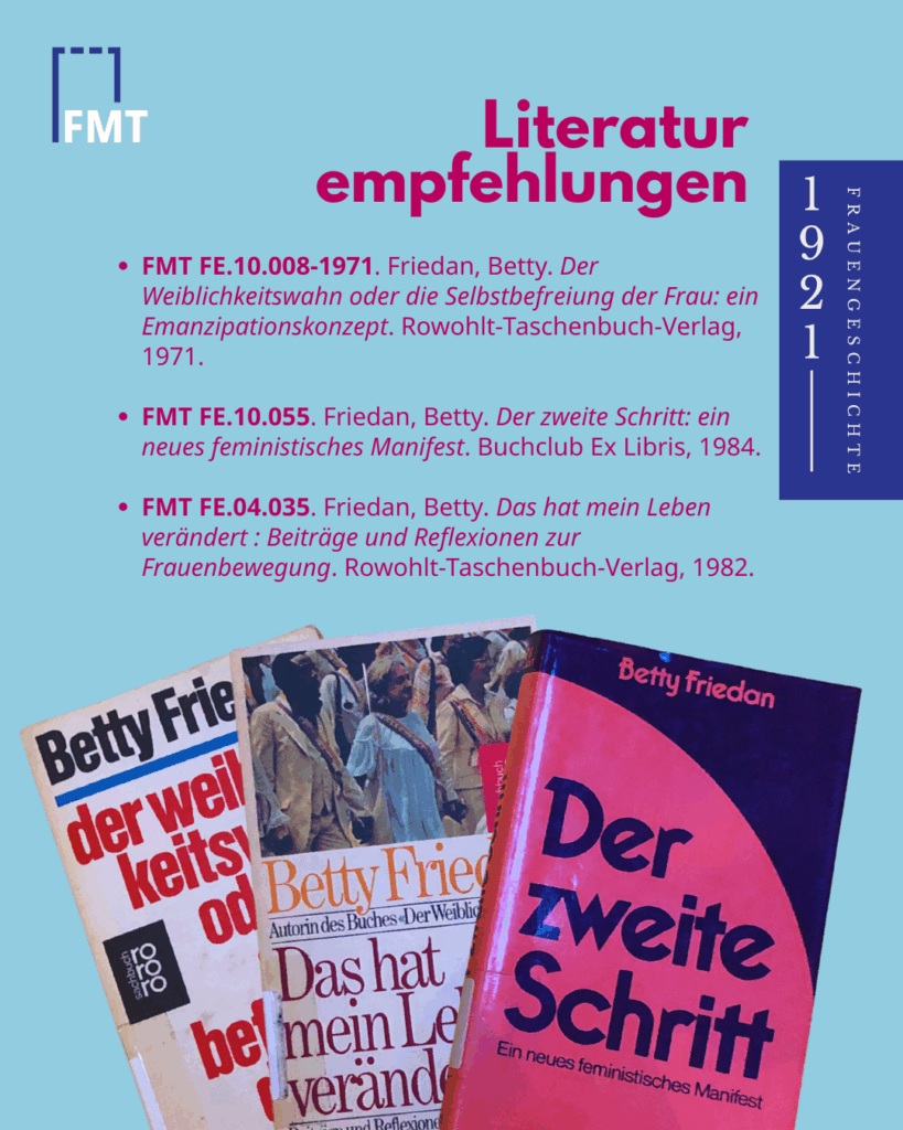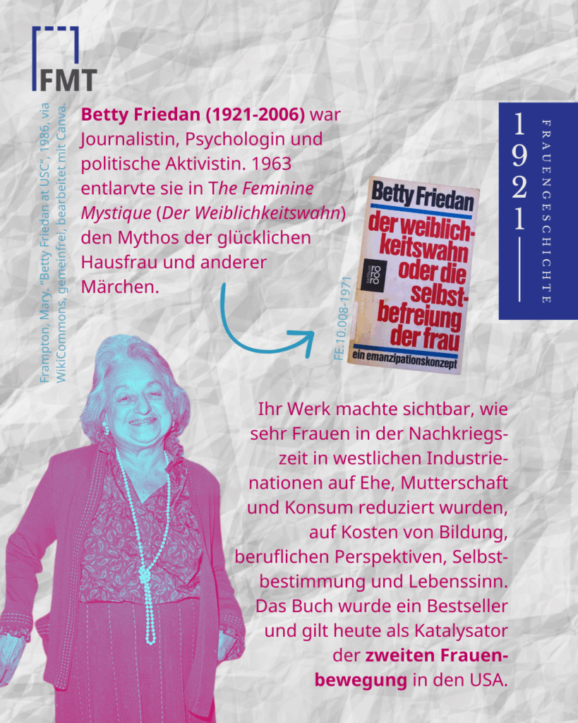 Friedan war Journalistin, Psychologin und politische Aktivistin. 1963 entlarvte sie in The Feminine Mystique (Der Weiblichkeitswahn, FE.10.008-1971) den Mythos der glücklichen Hausfrau und anderer Märchen, mit denen man Frauen nach dem zweiten Weltkrieg zurück ins Haus und unter die Obhut eines Ehemannes verwies. Ihr Werk machte sichtbar, wie sehr Frauen in der Nachkriegszeit in westlichen Industrienationen auf Ehe, Mutterschaft und Konsum reduziert wurden, auf Kosten von Bildung, beruflichen Perspektiven, Selbstbestimmung und Lebenssinn. Das Buch wurde ein Bestseller und gilt heute als einer der Auslöser der zweiten Frauenbewegung in den USA.