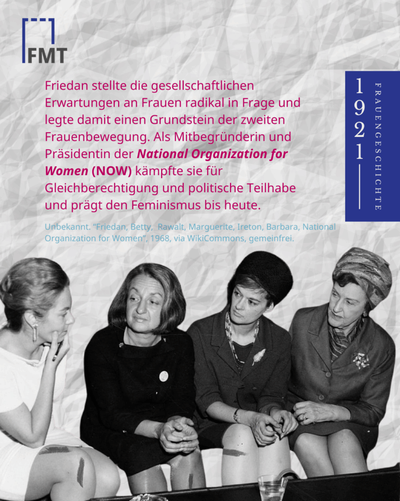 Friedan stellte die gesellschaftlichen Erwartungen an Frauen radikal in Frage und legte damit einen Grundstein der zweiten Frauenbewegung. Als Mitbegründerin und Präsidentin der National Organization for Women (NOW) kämpfte sie für Gleichberechtigung und politische Teilhabe und prägt den Feminismus bis heute.