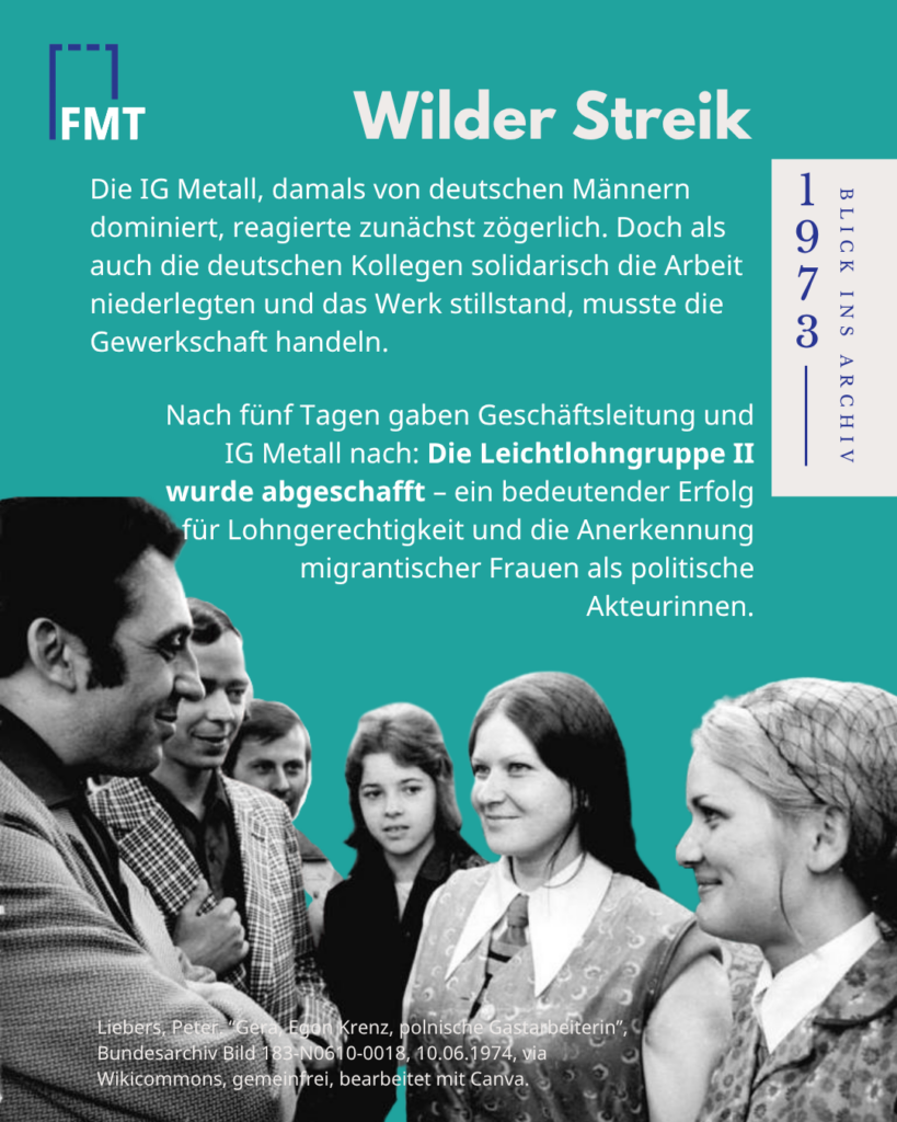 Als die Frauen sich zusammenschlossen und „Eine Mark mehr für alle!“ forderten, begann ein „wilder Streik“, d.h. selbstorganisiert, ohne gewerkschaftliche Führung. Die IG Metall, damals von deutschen Männern dominiert, reagierte zunächst zögerlich. Doch als auch die deutschen Kollegen solidarisch die Arbeit niederlegten und das Werk stillstand, musste die Gewerkschaft handeln. Nach fünf Tagen gaben Geschäftsleitung und IG Metall nach. Die Leichtlohngruppe II wurde abgeschafft – ein bedeutender Erfolg für Lohngerechtigkeit und die Anerkennung migrantischer Frauen als politische Akteurinnen.