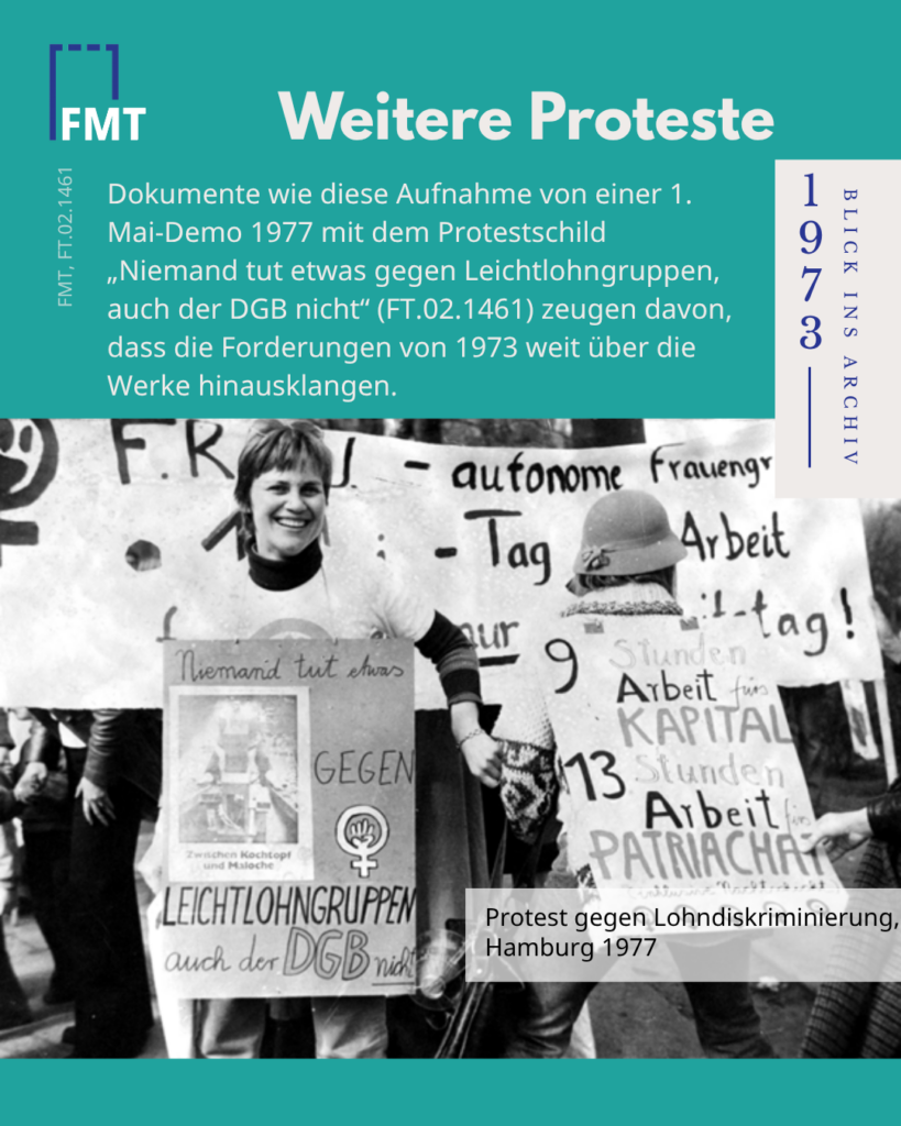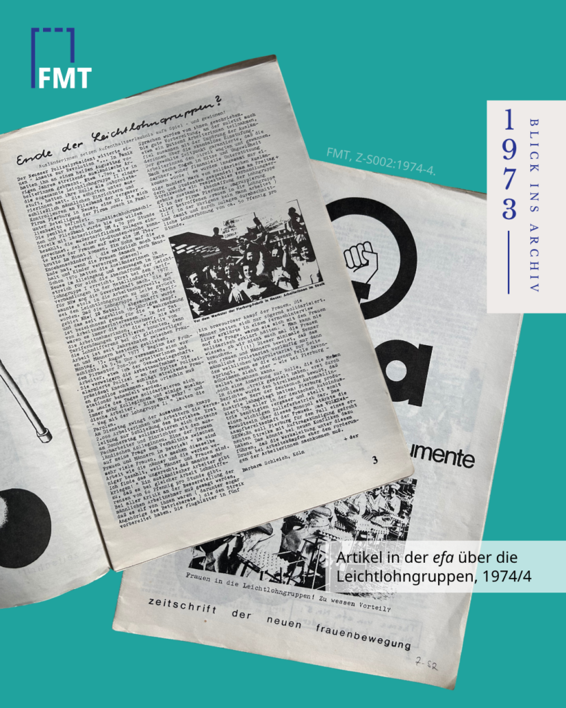 Im Bestand des FMT finden sich zahlreiche Materialien zu diesem Kapitel feministischer Arbeitsgeschichte, wie z.B. Presseberichte aus den 1970ern (PD-AR.10.01), oder der Aufsatz von Barbara Schleich in „efa“ (1974/4) über das Ende der Leichtlohngruppen. Bis heute erinnert der Pierburg-Streik daran, dass Gleichberechtigung und faire Arbeit immer (weiter) erkämpft werden müssen.