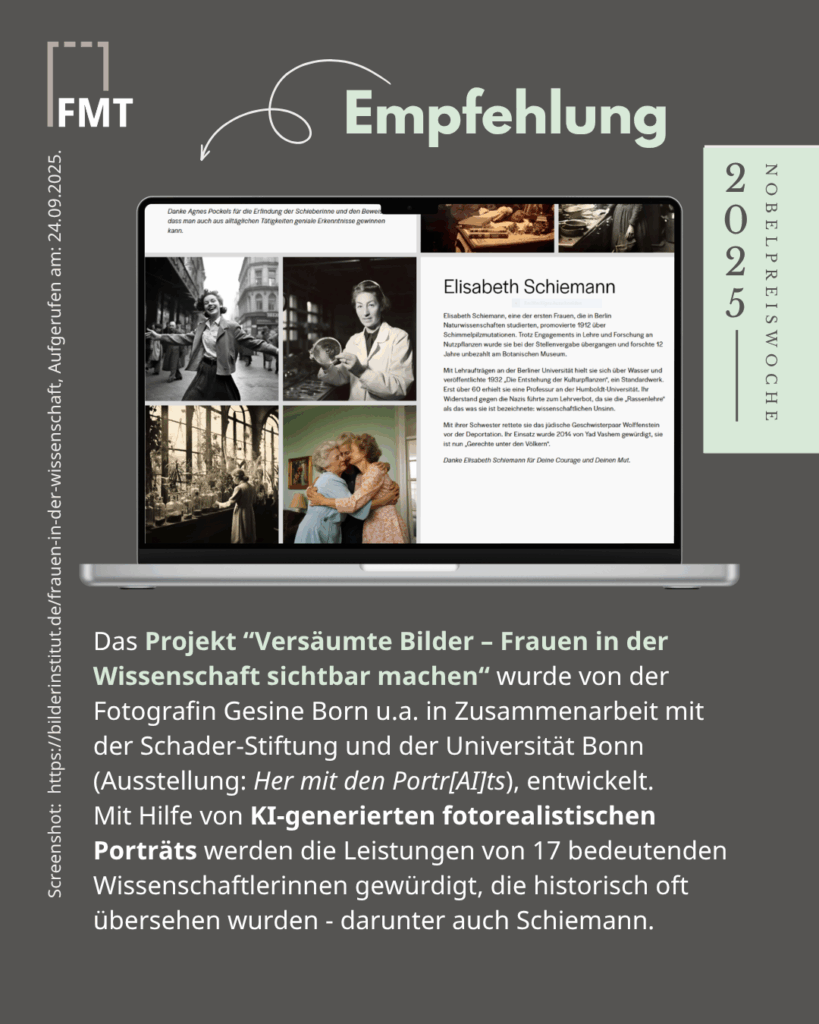 Ausstellung des KI-Projekts unter der Leitung von Gesine Born (Bilderinstitut) zu versäumten Bildern von Frauen in der Wissenschaft: „Her mit den Port[AI]ts“ (Universität Bonn). Das ganze Projekt gibt es hier.