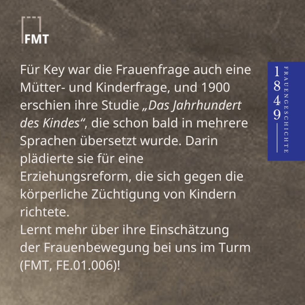 Für Key war die Frauenfrage auch eine Mütter- und Kinderfrage, und 1900 erschien ihre Studie „Das Jahrhundert des Kindes“, die schon bald in mehrere Sprachen übersetzt wurde. Darin plädierte sie für eine Erziehungsreform, die sich gegen die körperliche Züchtigung von Kindern richtete.