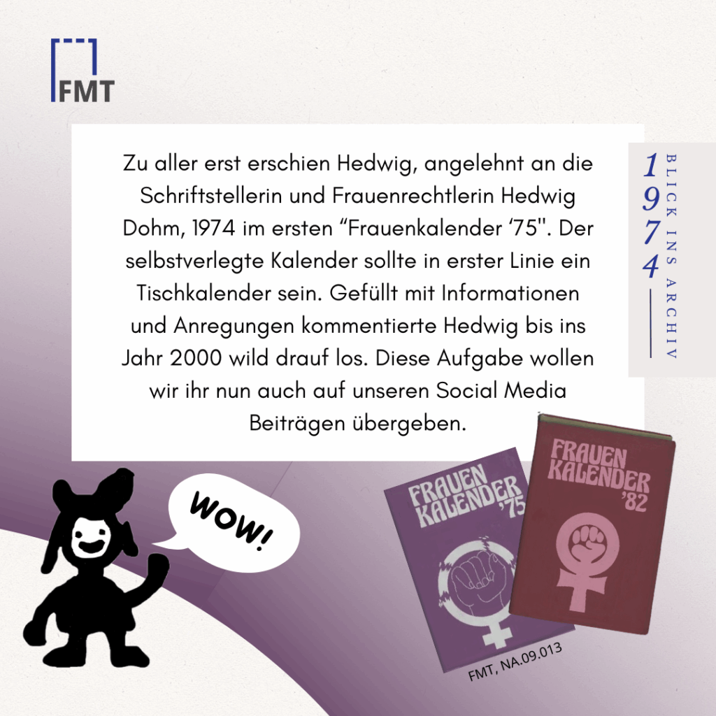 Vor 50 Jahren erschien Hedwig zum ersten Mal. Angelehnt an die Schriftstellerin und Frauenrechtlerin Hedwig Dohm trieb die kleine Zeichenfigur im ersten “Frauenkalender ‘75“ ihr Unwesen.