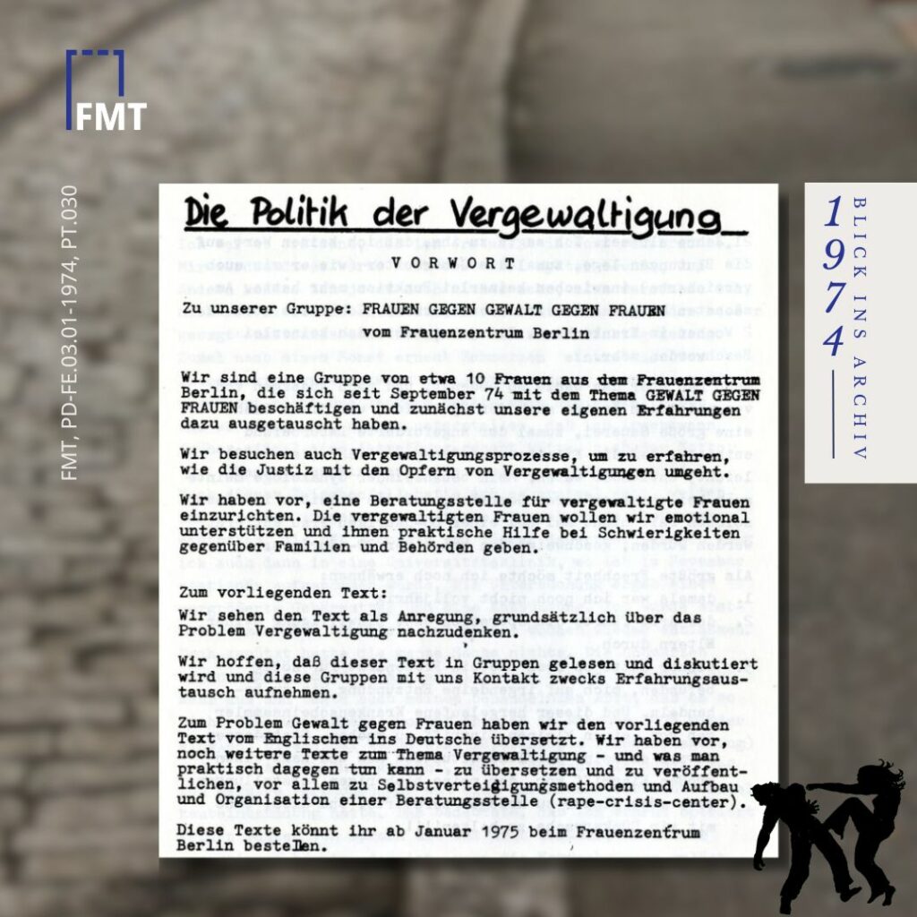 Im September 1974 gründeten ca. 10 Frauen im Berliner Frauenzentrum die erste Frauengruppe Frauen gegen Gewalt gegen Frauen. Sie veröffentlichten Texte zum Thema, beobachteten Vergewaltigungsprozesse und planten eine Beratungsstelle für Vergewaltigungsopfer nach dem Vorbild der amerikanischen Rape-Crisis-Centers.
