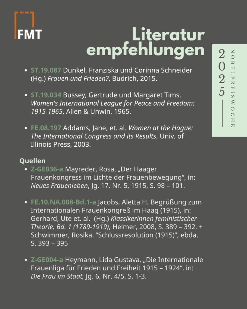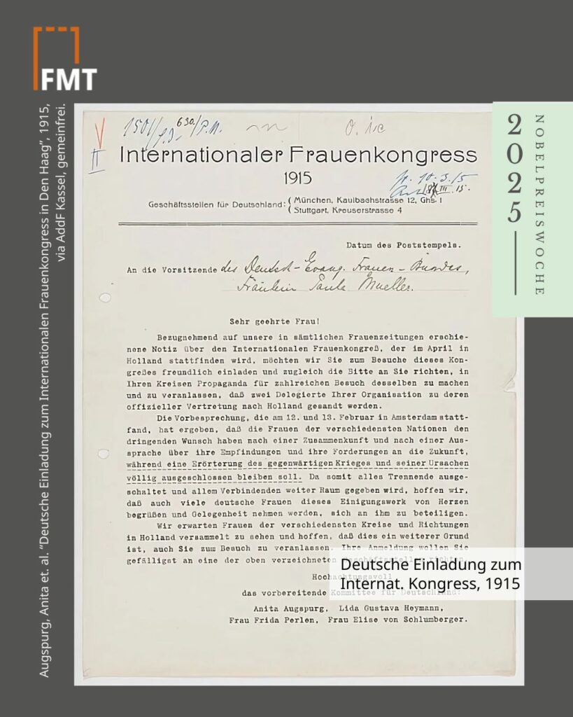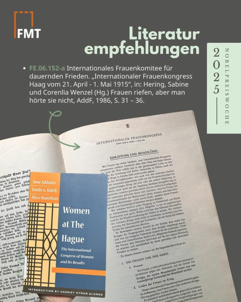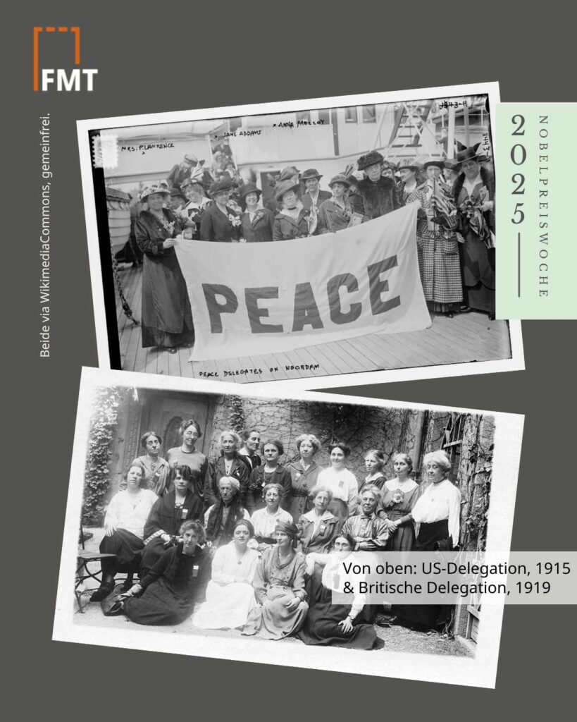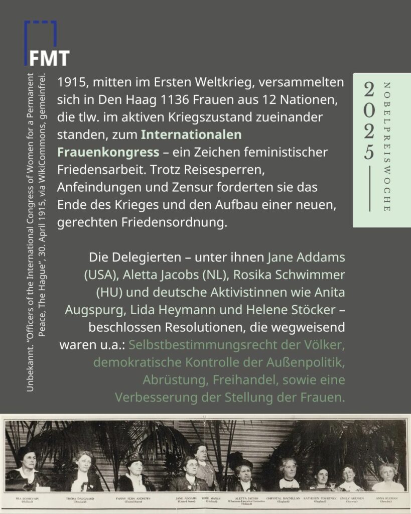 Symbolisch schlagen wir in der Nobelpreiswoche 2025 eine Brücke: Zwei führende Köpfe des Haager Kongresses wurden später tatsächlich mit dem Friedensnobelpreis geehrt – Jane Addams (1931) und Emily Greene Balch (1946). Doch die Visionen all jener Frauen von 1915 waren „den Nobelpreis wert“: Sie verbanden früh feministische Kämpfe um Rechte mit einer globalen Friedensbewegung.