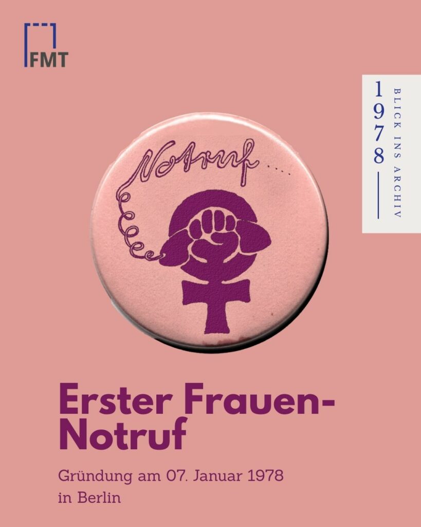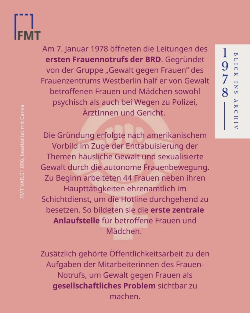 Am 7. Januar 1978 öffneten die Leitungen des ersten Frauen-Notrufs der BRD. Gegründet von der Gruppe „Gewalt gegen Frauen“ des Frauenzentrums Westberlin half er von Gewalt betroffenen Frauen und Mädchen sowohl psychisch als auch bei Wegen zu Polizei, ÄrztInnen und Gericht. 📞🆘