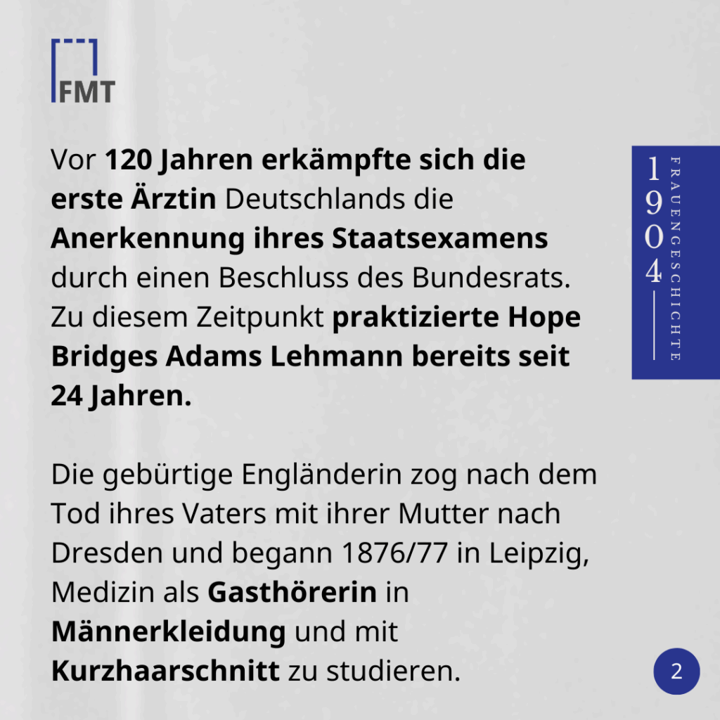 Vor 120 Jahren erkämpfte sich die erste Ärztin Deutschlands die Anerkennung ihres Staatsexamens durch einen Beschluss des Bundesrats. Zu diesem Zeitpunkt praktizierte Hope Bridges Adams Lehmann bereits seit 24 Jahren.