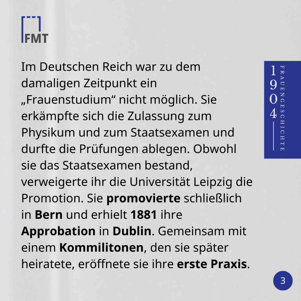 Sie promovierte schließlich in Bern und erhielt 1881 ihre Approbation in Dublin. Gemeinsam mit einem Kommilitonen, den sie später heiratete, eröffnete sie ihre erste Praxis.