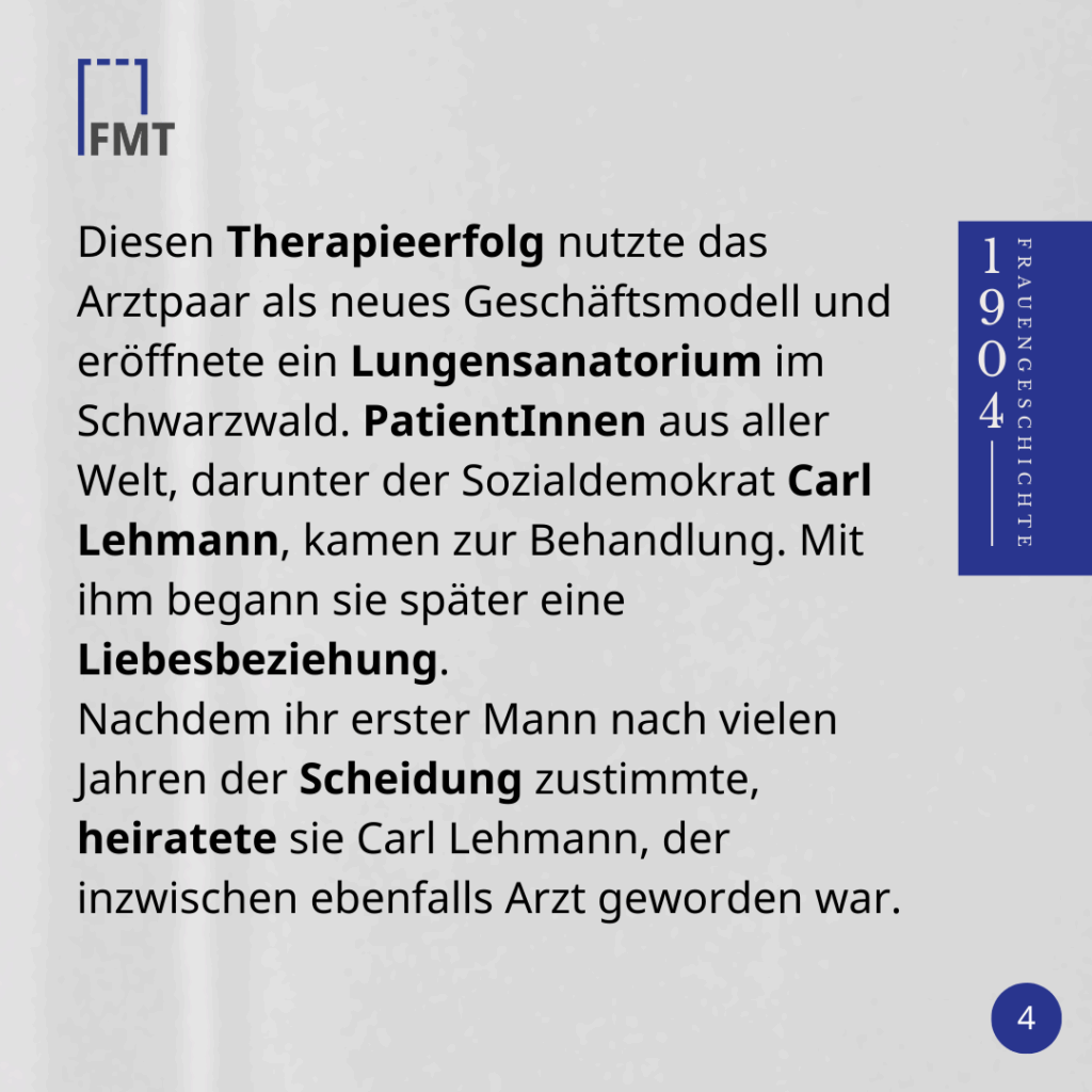 Nach der Geburt ihres zweiten Kindes erkrankte sie an Tuberkulose, konnte sich aber durch Wandern, Höhenluft und eine gezielte Gewichtszunahme erholen. Diesen Therapieerfolg nutzte das Arztpaar als neues Geschäftsmodell und eröffnete ein Lungensanatorium im Schwarzwald. PatientInnen aus aller Welt, darunter der Sozialdemokrat Carl Lehmann, kamen zur Behandlung. Mit ihm begann sie später eine Liebesbeziehung.