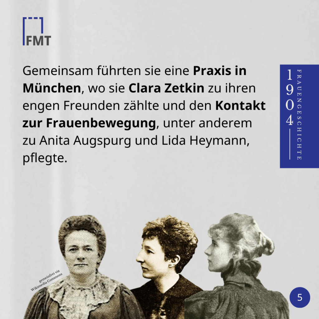 Nachdem ihr erster Mann nach vielen Jahren der Scheidung zustimmte, heiratete sie Carl Lehmann, der inzwischen ebenfalls Arzt geworden war. Gemeinsam führten sie eine Praxis in München, wo sie Clara Zetkin zu ihren engen Freunden zählte und den Kontakt zur Frauenbewegung, unter anderem zu Anita Augspurg und Lida Heymann, pflegte.