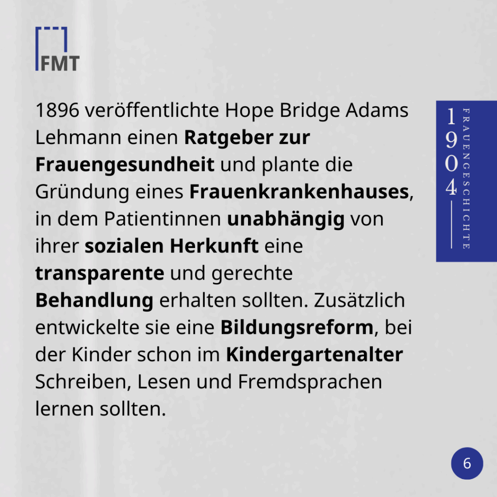 1896 veröffentlichte Hope Bridge Adams Lehmann einen Ratgeber zur Frauengesundheit und plante die Gründung eines Frauenkrankenhauses, in dem Patientinnen unabhängig von ihrer sozialen Herkunft eine transparente und gerechte Behandlung erhalten sollten. Zusätzlich entwickelte sie eine Bildungsreform, bei der Kinder schon im Kindergartenalter Schreiben, Lesen und Fremdsprachen lernen sollten.