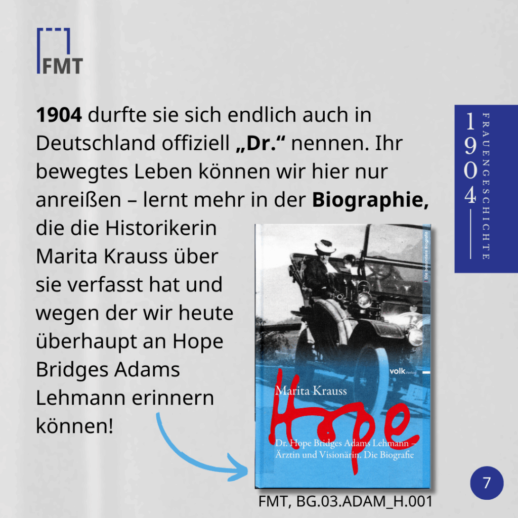 1904 durfte sie sich endlich auch in Deutschland offiziell „Dr.“ nennen. Ihr bewegtes Leben können wir hier nur anreißen – lernt mehr in der Biographie, die die Historikerin Marita Krauss über sie verfasst hat und wegen der wir heute überhaupt an Hope Bridges Adams Lehmann erinnern können!