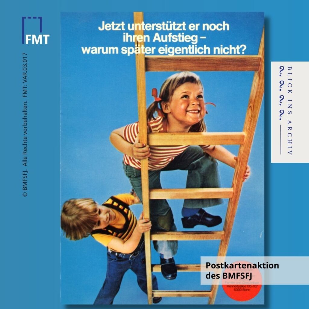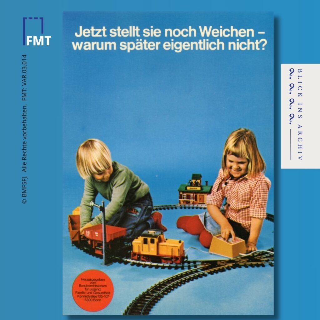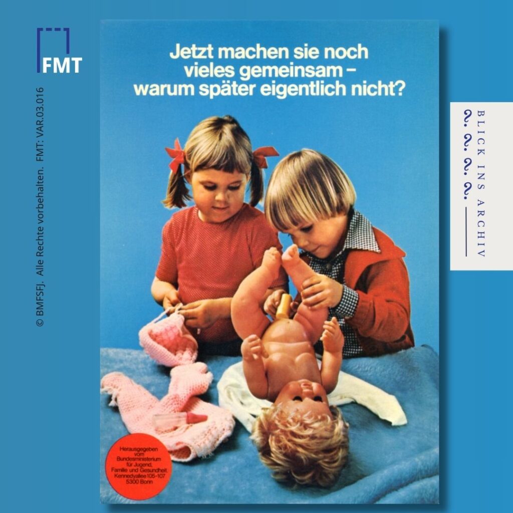 Zum Internationalen Mädchentag haben wir im FrauenMediaTurm das Thema Geschlechterrollen genauer unter die Lupe genommen und sind dabei auf Postkarten aus einem Projekt des Bundesministeriums für Jugend, Familie, Frauen und Gesundheit in Bonn gestoßen. Jede zeigt mindestens ein Kind, das spielt, lernt oder entdeckt. Sie wickeln, klettern, bauen und kochen – ganz unabhängig von gängigen Geschlechterklischees. „Warum später eigentlich nicht?“, fragt die Postkarte die Betrachterin. Darin steckte auch die Frage nach der Entwicklung von geschlechterkonformem Verhalten bei Berufswahl und Familiengründung im Erwachsenenleben, die Feministinnen sich immer wieder stellten.