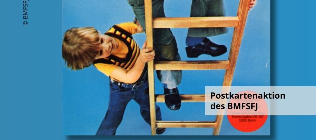Zum Internationalen Mädchentag haben wir im FrauenMediaTurm das Thema Geschlechterrollen genauer unter die Lupe genommen und sind dabei auf Postkarten aus einem Projekt des Bundesministeriums für Jugend, Familie, Frauen und Gesundheit in Bonn gestoßen. Jede zeigt mindestens ein Kind, das spielt, lernt oder entdeckt. Sie wickeln, klettern, bauen und kochen – ganz unabhängig von gängigen Geschlechterklischees. „Warum später eigentlich nicht?“, fragt die Postkarte die Betrachterin. Darin steckte auch die Frage nach der Entwicklung von geschlechterkonformem Verhalten bei Berufswahl und Familiengründung im Erwachsenenleben, die Feministinnen sich immer wieder stellten.