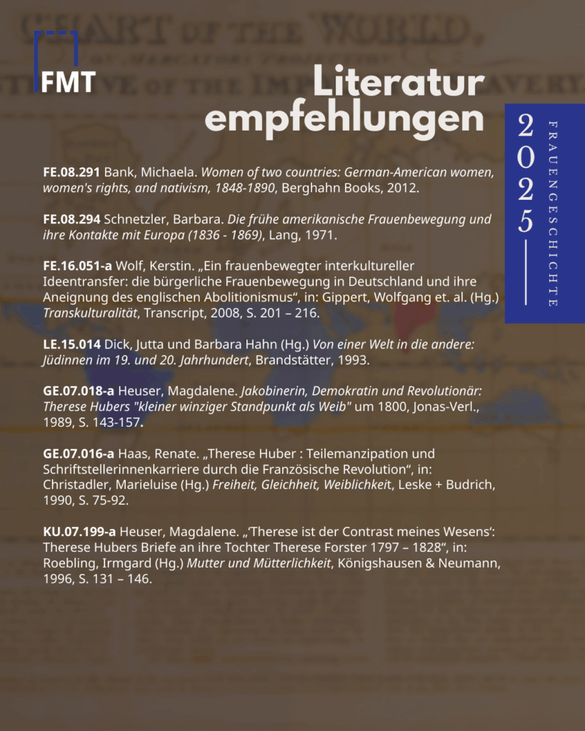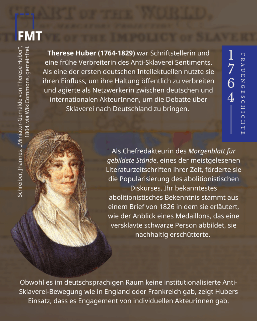 - Therese Huber (1764-1829) war deutsche Schriftstellerin und frühe Verbreiterin des Anti-Sklaverei Sentiments. Als Redakteurin popularisierte sie den abolitionistischen Diskurs.
