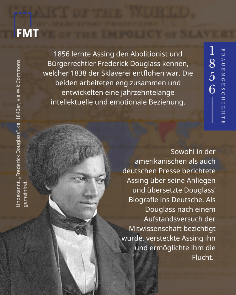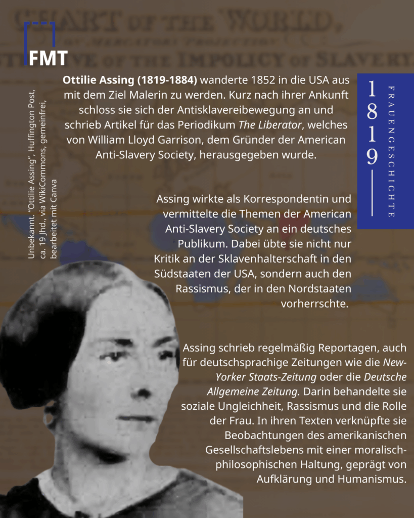 - Ottilie Assing (1819-1884) wanderte in die USA aus und schloss sich dort der Antisklavereibewegung an. Als Korrespondentin vermittelte sie die Themen der Anti-Slavery Society an eine deutsche Zuhörerschaft.