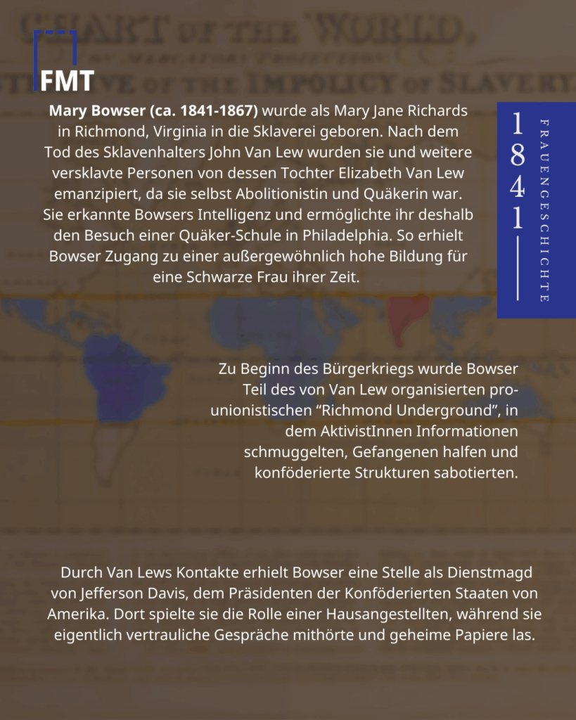 - Mary Bowser (ca. 1841-1867) war eine ehemals versklavte Frau, die als Spionin im Bürgerkrieg für die Nordstaaten tätig war. Sie setzte sich für die Rechte derer ein, die aus der Sklaverei befreit wurden.