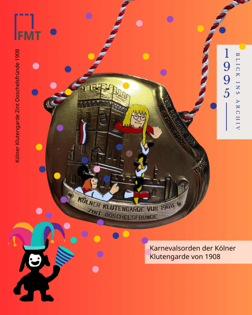 #Fastelovend ist jedes Jahr, aber 1995, kurz nach Einzug, wurde dem FrauenMediaTurm gleich eine große Karnevalsehre zuteil: Ein eigens gestalteter Orden, mit dem die Kölner Klutengarde von 1908 „Zint Ooschelsfründe“ das feministische Archiv und Dokumentationszentrum und seine Gründerin Alice Schwarzer würdigte