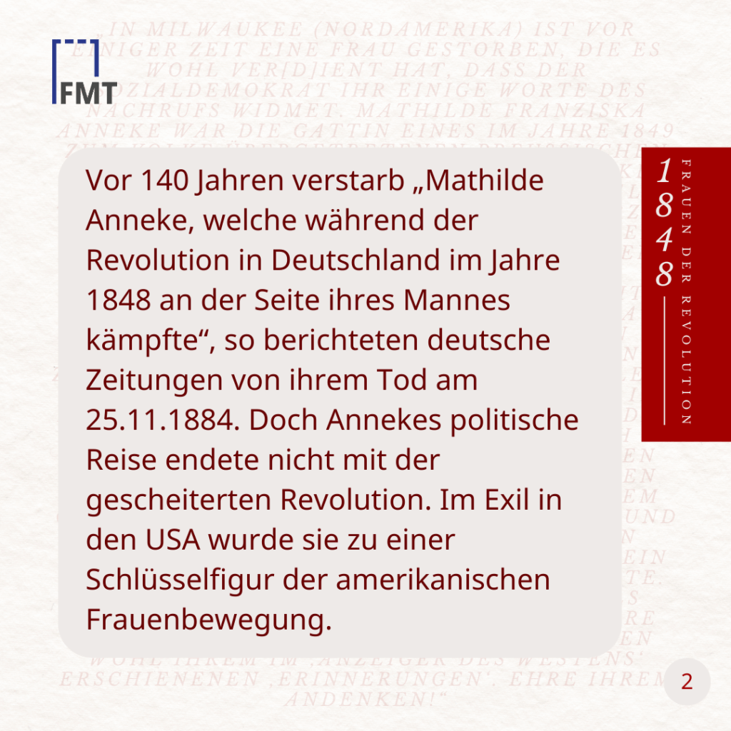 #otd im Jahre 1884 verstarb „Mathilde Anneke, welche während der Revolution in Deutschland an der Seite ihres Mannes kämpfte“, so berichteten deutsche Zeitungen von ihrem Tod.