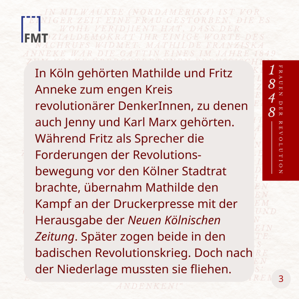 In Köln gehörten Mathilde und Fritz Anneke zum engen Kreis revolutionärer DenkerInnen, zu denen auch Jenny und Karl Marx gehörten. Während Fritz als Sprecher die Forderungen der Revolutionsbewegung vor den Kölner Stadtrat brachte, übernahm Mathilde den Kampf an der Druckerpresse mit der Herausgabe der Neuen Kölnischen Zeitung. Später zogen beide in den badischen Revolutionskrieg. Doch nach der Niederlage mussten sie fliehen.