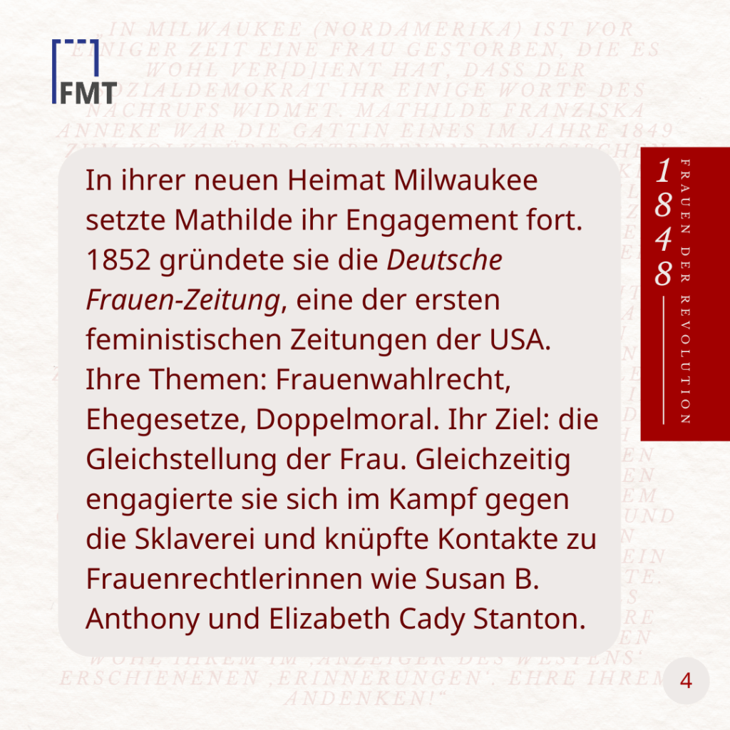 In ihrer neuen Heimat Milwaukee setzte Mathilde ihr Engagement fort. 1852 gründete sie die „Deutsche Frauen-Zeitung“, eine der ersten feministischen Zeitungen der USA. Ihre Themen: Frauenwahlrecht, Ehegesetze, Doppelmoral. Ihr Ziel: die Gleichstellung der Frau. Gleichzeitig engagierte sie sich im Kampf gegen die Sklaverei und knüpfte Kontakte zu führenden Frauenrechtlerinnen wie Susan B. Anthony und Elizabeth Cady Stanton.