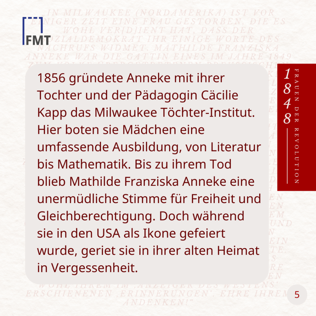 1856 gründete Anneke mit ihrer Tochter und der Pädagogin Cäcilie Kapp das Milwaukee Töchter-Institut. Hier boten sie Mädchen eine umfassende Ausbildung, von Literatur bis Mathematik. Doch während sie in den USA als Ikone gefeiert wurde, geriet sie in ihrer alten Heimat in Vergessenheit.