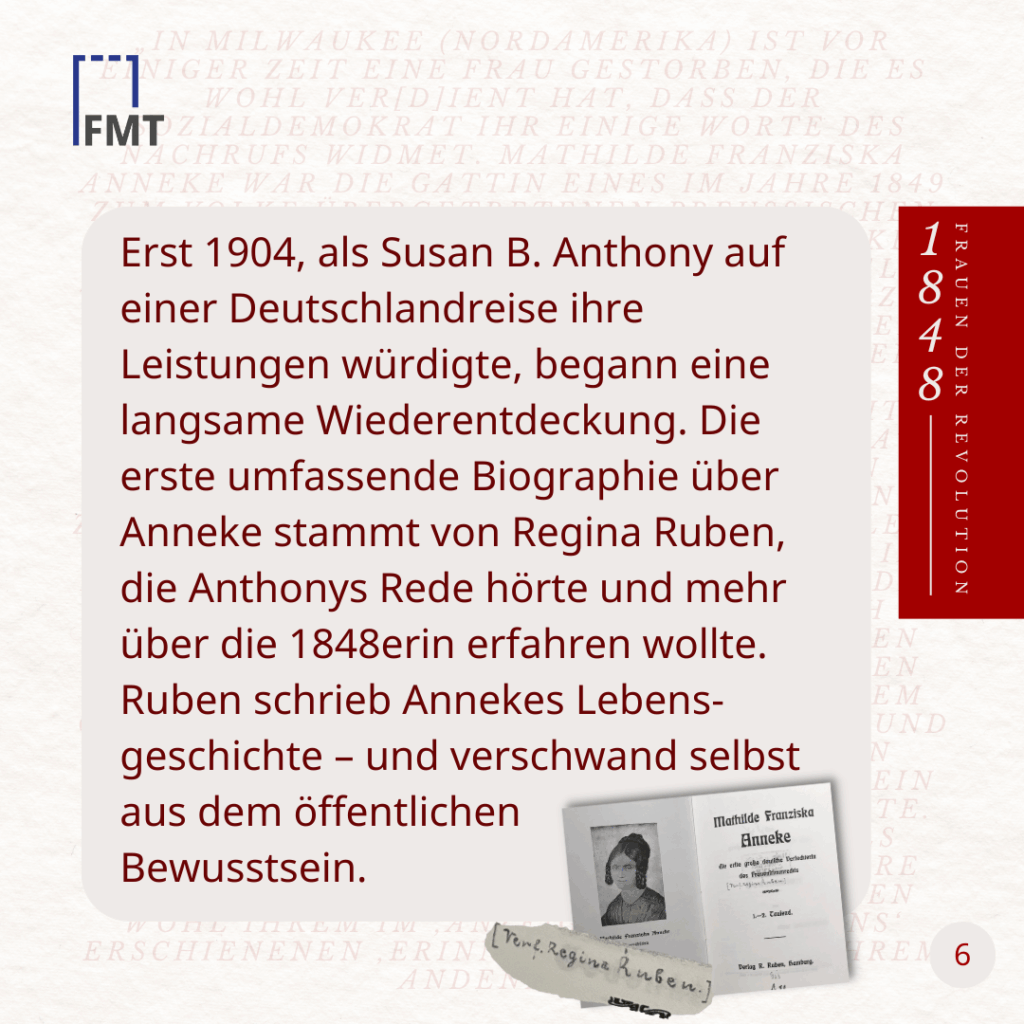 Erst 1904, als Susan B. Anthony auf einer Deutschlandreise ihre Leistungen würdigte, begann eine langsame Wiederentdeckung. Die erste umfassende Biographie über Anneke stammt von Regina Ruben, die Anthonys Rede hörte und mehr über die 1848erin erfahren wollte. Ruben schrieb Annekes Lebensgeschichte – und verschwand selbst aus dem öffentlichen Bewusstsein.