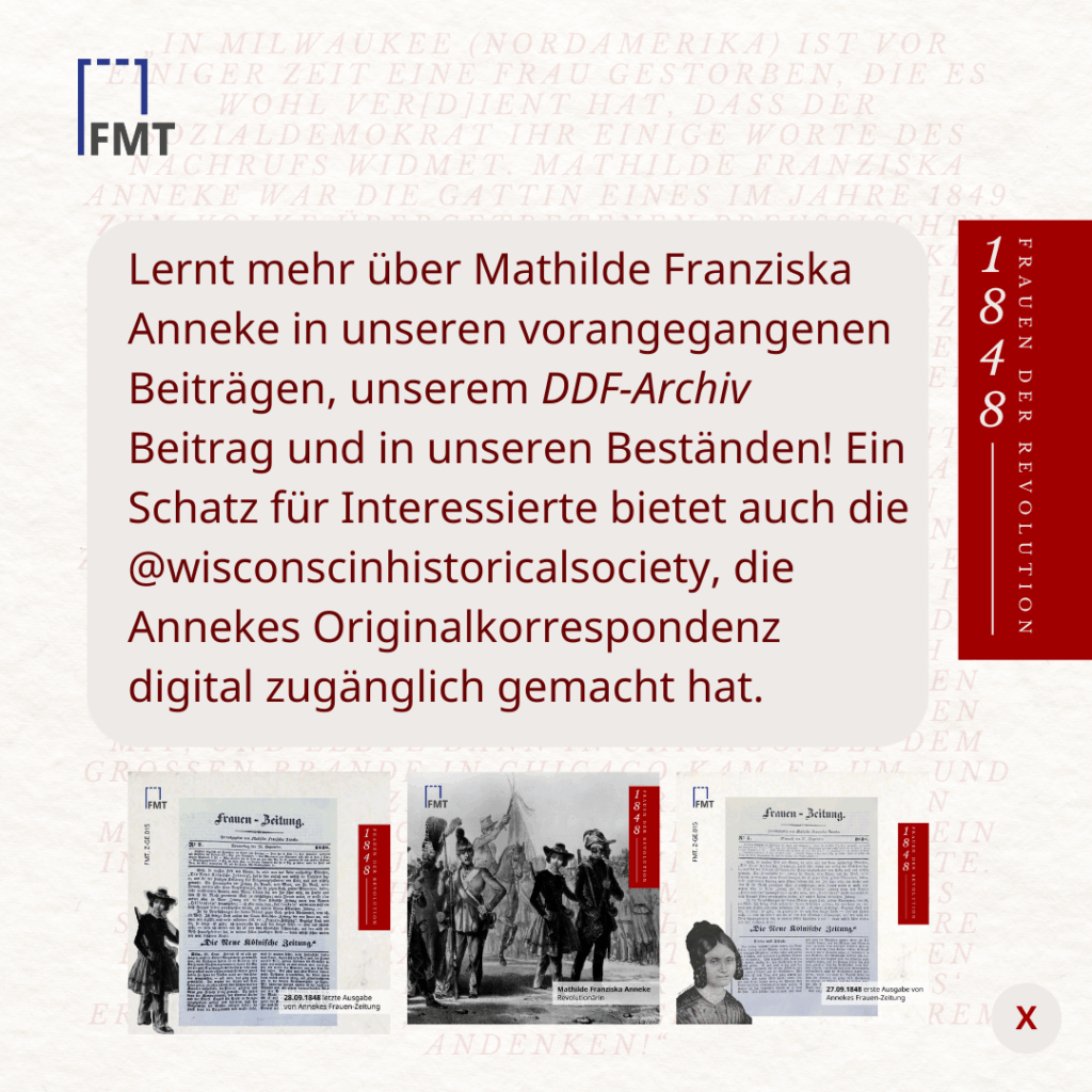 Lernt mehr über Mathilde Franziska Anneke in unseren vorangegangenen Beiträgen, unserem DDF-Archiv Beitrag und in unseren Beständen! Ein Schatz für Interessierte bietet auch die @wisconscinhistoricalsociety, die Annekes Originalkorrespondenz digital zugänglich gemacht hat.