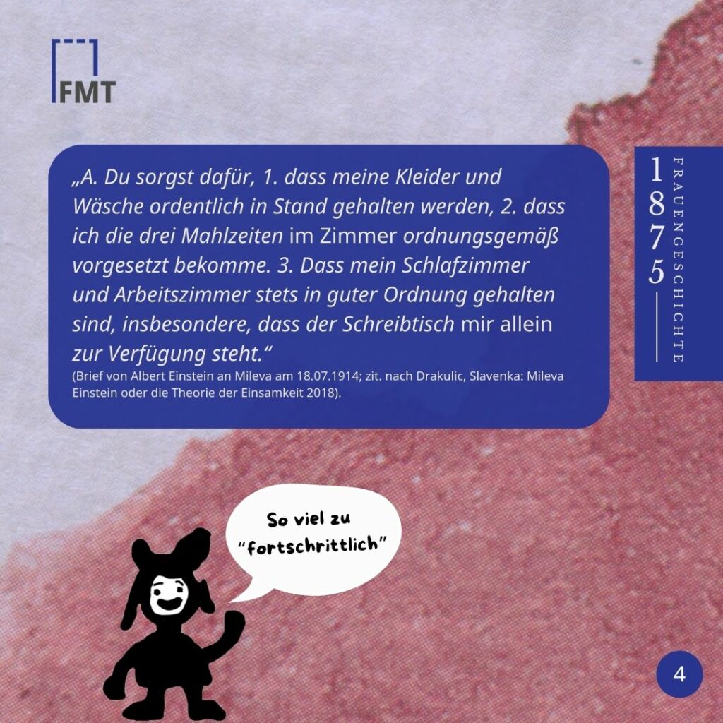Ihr gemeinsames Leben begann fortschrittlich und gleichberechtigt: gemeinsames Studium, Diskussionen auf Augenhöhe und eine uneheliche Tochter. Gegen Ende ihrer 1903 geschlossenen Ehe wendete sich jedoch das Blatt und Einstein stellte ihr verschiedene Bedingungen auf, unter denen er von einer Scheidung absehen würde [siehe Kachel 4]. So viel zu „fortschrittlich“.