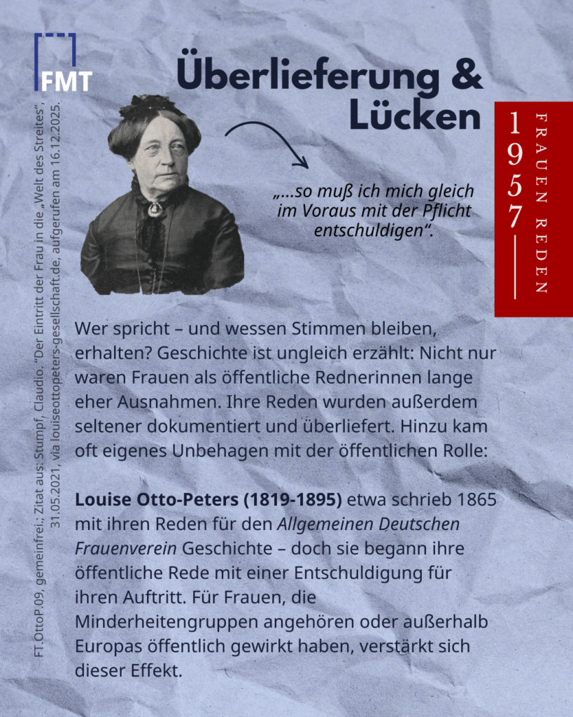 Wer spricht – und wessen Stimmen bleiben erhalten? Geschichte ist ungleich erzählt: Nicht nur waren Frauen als öffentliche Rednerinnen lange eher Ausnahmen. Ihre Reden wurden außerdem seltener dokumentiert und überliefert. Hinzu kam oft ein eigenes Unbehagen mit der öffentlichen Rolle: Louise Otto-Peters etwa schrieb 1865 mit ihren Reden für den Allgemeinen Deutschen Frauenverein Geschichte – doch sie begann ihre öffentliche Rede mit einer Entschuldigung für ihren Auftritt: „…so muß ich mich gleich im Voraus mit der Pflicht entschuldigen“.