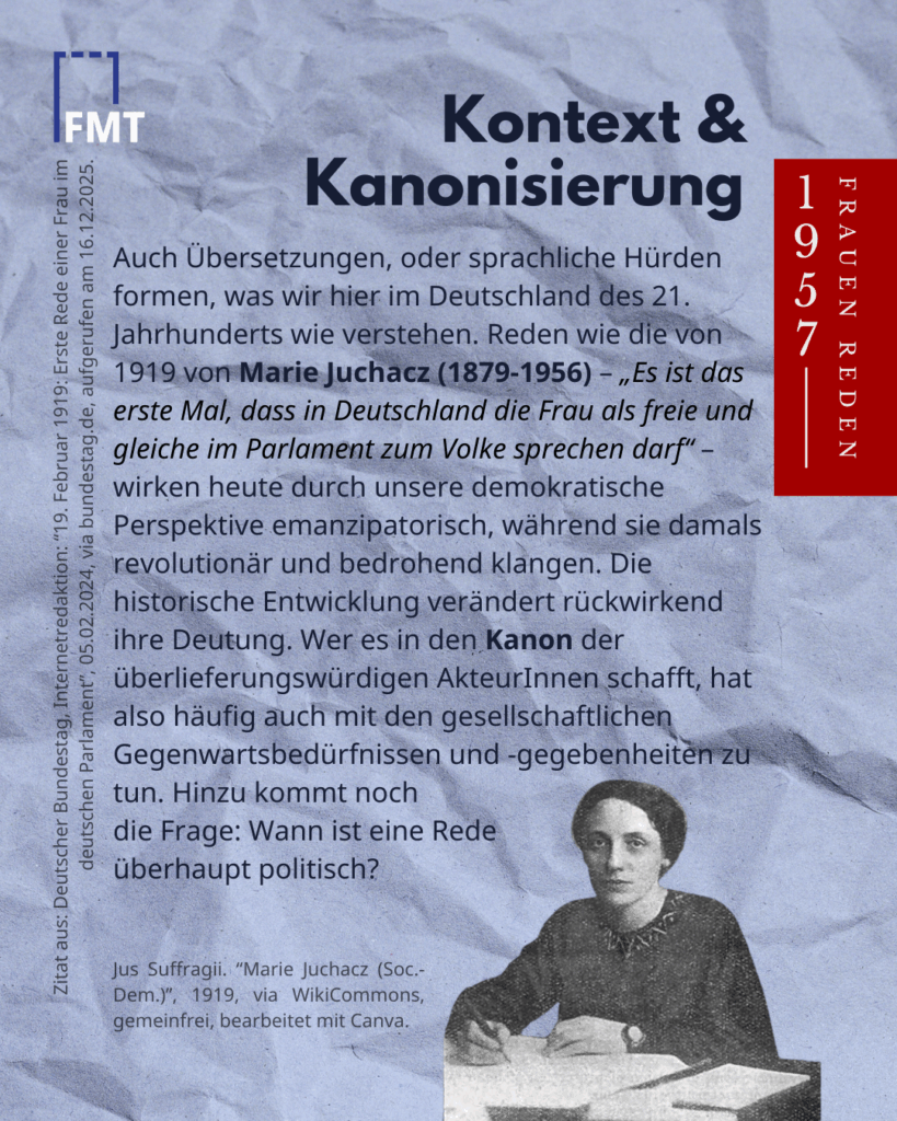 Für Frauen, die Minderheitengruppen angehören oder außerhalb Europas öffentlich gewirkt haben, verstärkt sich dieser Effekt. Sprachliche Hürden formen, was wir hier im Deutschland des 21. Jahrhunderts wie verstehen. Reden wie die von Marie Juchacz 1919 – „Es ist das erste Mal, dass in Deutschland die Frau als freie und gleiche im Parlament zum Volke sprechen darf“ – wirken heute durch unsere demokratische Perspektive emanzipatorisch, während sie damals für viele Menschen revolutionär und bedrohlich klangen. Die historische Entwicklung verändert rückwirkend ihre Deutung. Wer es in den Kanon der überlieferungswürdigen AkteurInnen schafft, hat also häufig auch mit den gesellschaftlichen Gegenwartsbedürfnissen und -gegebenheiten zu tun.