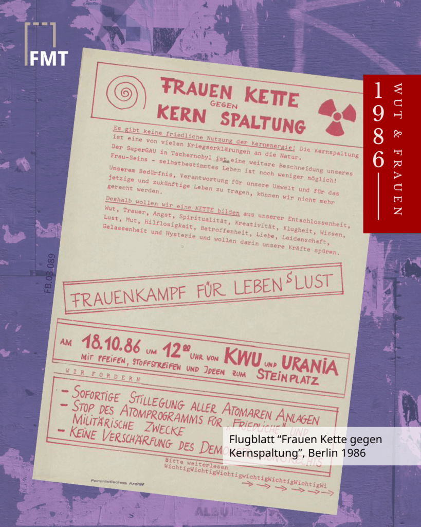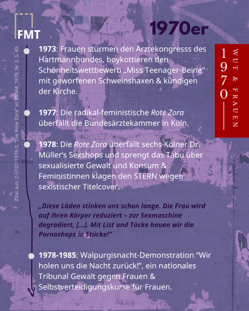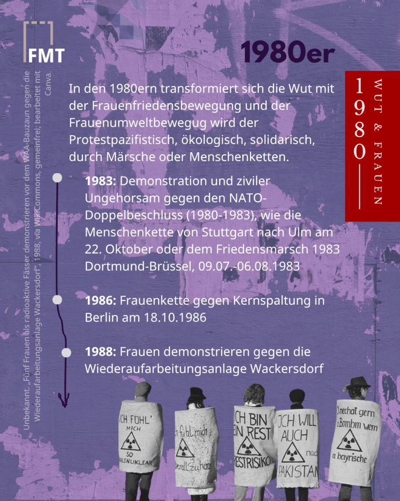 Ende der 1970er schließlich richtet sich die Wut gezielt gegen sexualisierte Gewalt und frauenverachtenden Konsum: z.B. attackieren Frauen der „Roten Zora“ in Köln Sexshops der Kette „Dr. Müller“, die mit Gewaltfantasien und Erniedrigung von Frauen Profit machen. In den 1980ern transformiert sich die Wut: Märsche, Aktionen und Menschenketten der Frauenfriedensbewegung und der Frauenökologiebewegung – Wut wird pazifistisch, ökologisch, solidarisch. 🕊️🌍