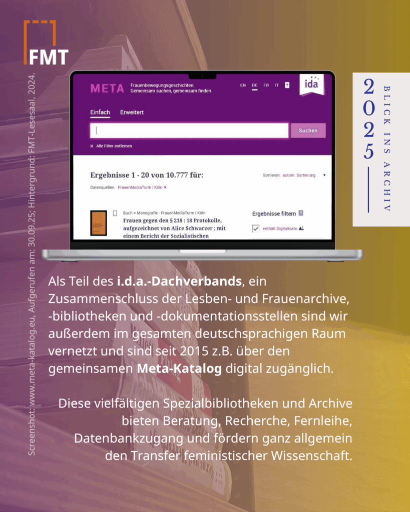 1984 wurde der FrauenMediaTurm nicht nur als Archiv, sondern auch als feministisches Sammel- und Recherchezentrum gegründet. Seit 1994 haben wir unseren Sitz als FMT in Köln. Mit unserem Bestand (80.000 Textdokumente) sind wir bis heute Teil einer Wissenslandschaft, die sich der Bewahrung, Dokumentation und Zugänglichmachung feministischer und frauenbewegter Geschichte ebenso wie aktueller Inhalte verschrieben hat. 🤓