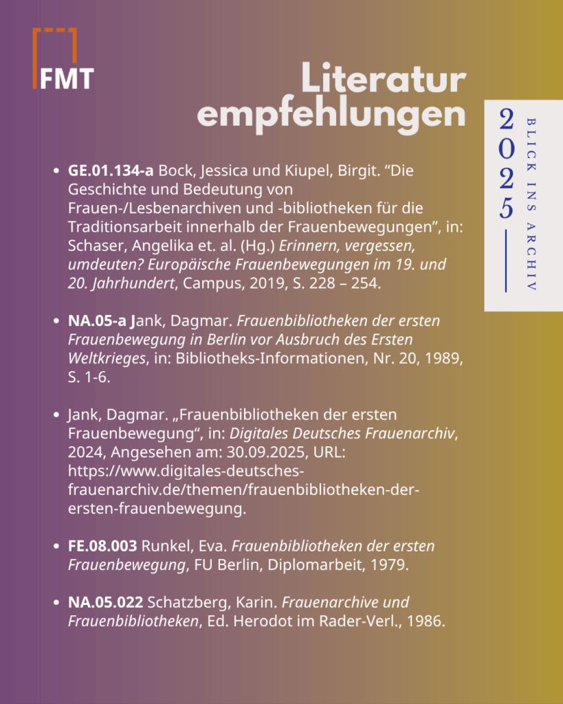 Wusstet ihr, dass Frauenbibliotheken in Deutschland bereits im 19. Jahrhundert entstanden? Schon damals gründeten Akteurinnen Einrichtungen zur Sammlung und Verbreitung frauenspezifischer Literatur, um Bildung und politisches Bewusstsein zu stärken. Ein wichtiges Beispiel ist die Bibliothek zur Frauenfrage des Berliner Vereins „Frauenwohl“ (gegründet 1895). Trotz ihrer großen Bedeutung litten Frauenbibliotheken lange unter mangelnder finanzieller Unterstützung und waren nur eingeschränkt zugänglich.