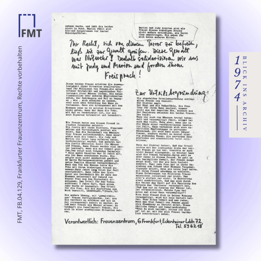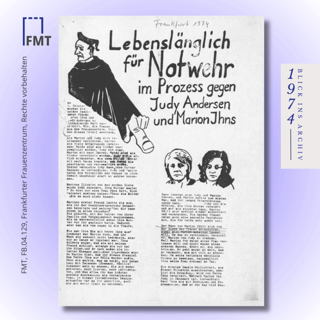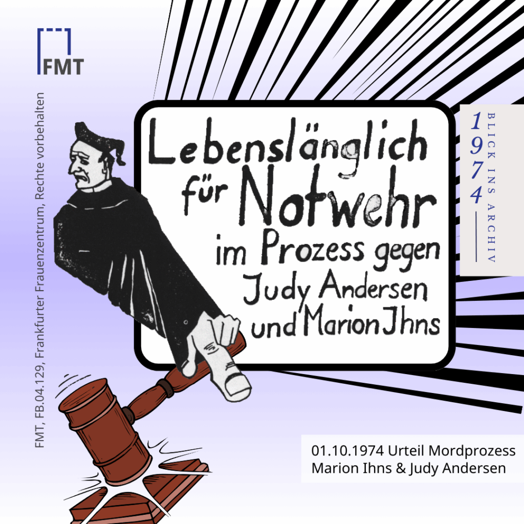 Heute vor 50 Jahren (01.10.1974) wurde das Urteil im Mordprozess gegen Marion Ihns und Judy Andersen gefällt. Beide Frauen wurden für den Auftragsmord am Ehemann von Marion Ihns zu lebenslänglicher Haft verurteilt. Die Geschichte der Frauen – die Vergewaltigung beider in der Kindheit, die Misshandlungen von Marion Ihns durch ihren Ehemann – fanden im Urteil keine Berücksichtigung. In der Presse dominierte eine reißerische und lesbenfeindliche Berichterstattung über das Paar. Frauengruppen aus ganz Deutschland demonstrierten nach der Urteilsverkündung vor dem Gerichtsgebäude in Itzehoe. Der Protest wurde zu einem Katalysator der Lesbenbewegung in der Bundesrepublik.