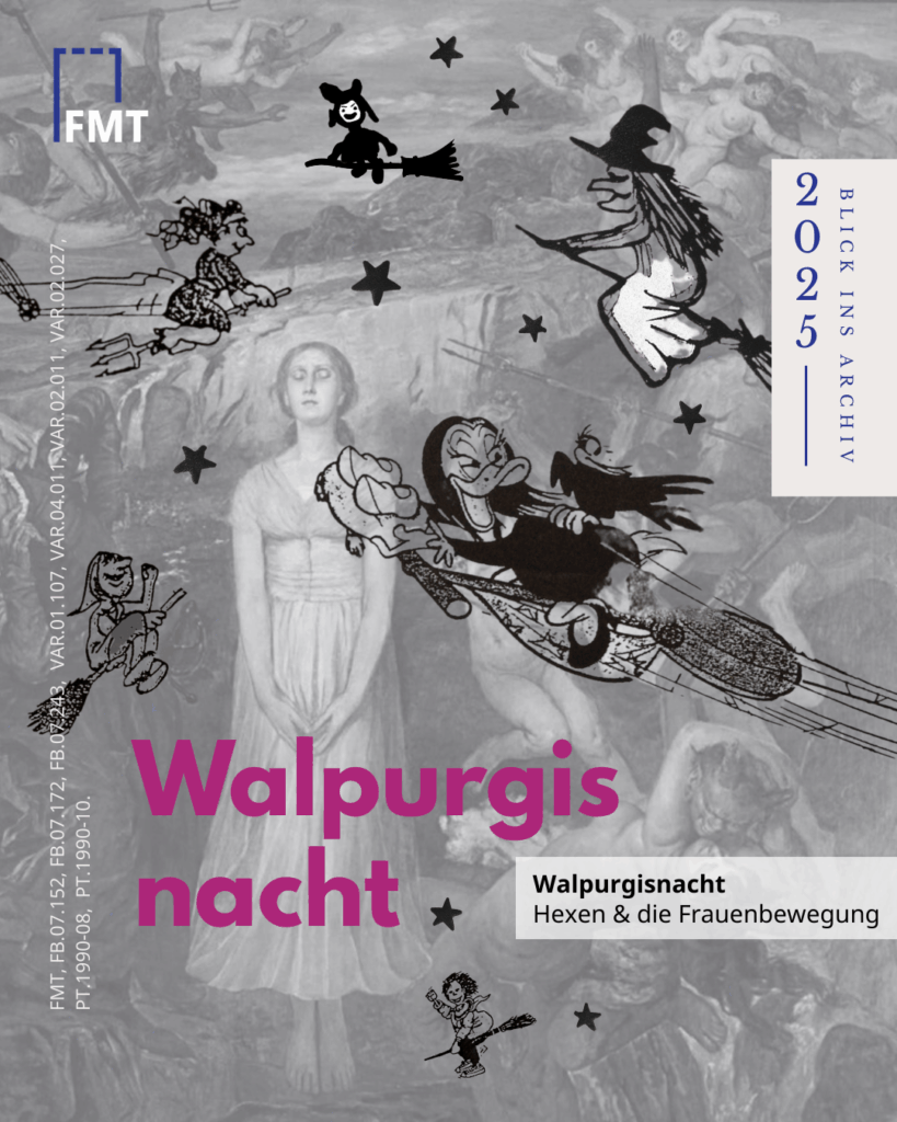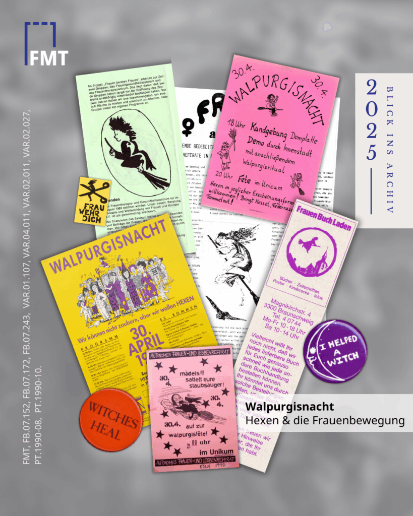 Spuren dieses Wandels sind auf zahlreichen Archivalien im FrauenMediaTurm zu finden: Flugblätter, Flyer, Lesezeichen und Buttons zeigen die Hexe als eigenwillige, kämpferische, aber oft auch lustige und liebenswerte Gestalt. Feministische Zeitschriften nannten sich „Hexengeflüster“, „Die kleine Hexe“ oder „Walpurgis-Zitig“. Neben dem Venusspiegel wurde die Hexe zum meist gebrauchten Symbol der Bewegung und schuf so Solidarität und Einigkeit.