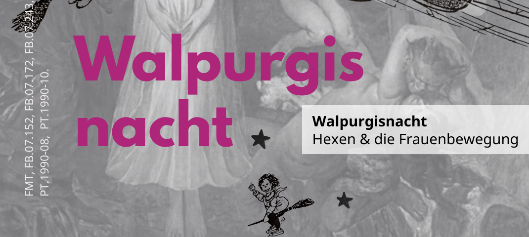 Spuren dieses Wandels sind auf zahlreichen Archivalien im FrauenMediaTurm zu finden: Flugblätter, Flyer, Lesezeichen und Buttons zeigen die Hexe als eigenwillige, kämpferische, aber oft auch lustige und liebenswerte Gestalt. Feministische Zeitschriften nannten sich „Hexengeflüster“, „Die kleine Hexe“ oder „Walpurgis-Zitig“. Neben dem Venusspiegel wurde die Hexe zum meist gebrauchten Symbol der Bewegung und schuf so Solidarität und Einigkeit.
