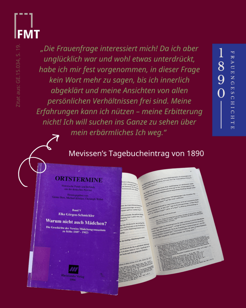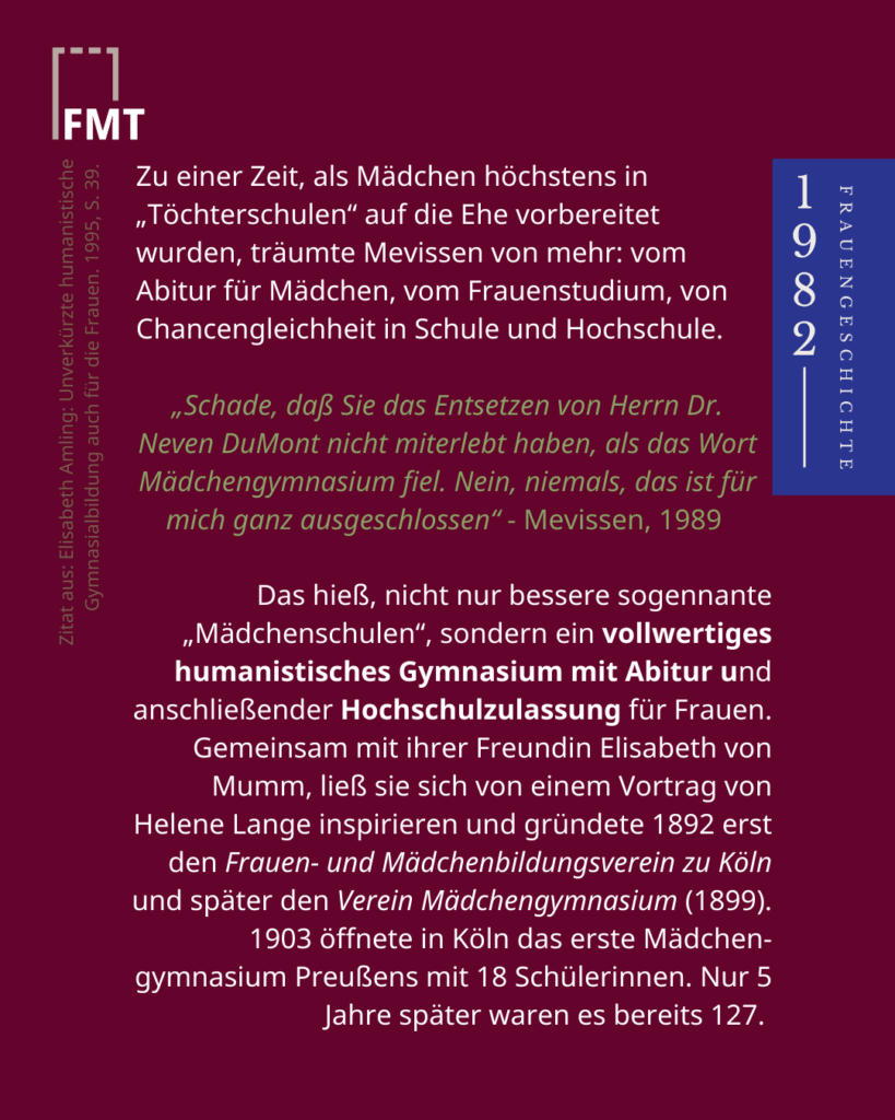 Sie war eine zentrale Figur der bürgerlichen Frauenbewegung in Köln, mit einem klaren Schwerpunkt auf Bildungs- und Rechtsfragen für Frauen.Zu einer Zeit, als Mädchen höchstens in „Töchterschulen“ auf die Ehe vorbereitet wurden, träumte Mevissen von mehr: vom Abitur für Mädchen, vom Frauenstudium, von Chancengleichheit in Schule und Hochschule. Mit Briefen, Petitionen, Vereinsarbeit und eigenem Vermögen setzte sie sich für Bildungsgerechtigkeit ein, denn darin sah sie den Weg zu einer gleichgestellten Gesellschaft.