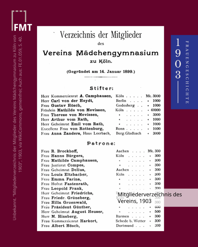 Das hieß, nicht nur bessere sog. „Mädchenschulen“, sondern ein vollwertiges humanistisches Gymnasium mit Abitur und anschließender Hochschulzulassung für Frauen.Gemeinsam mit ihrer Freundin Elisabeth von Mumm, ließ sie sich von einem Vortrag von Helene Lange inspirieren und gründete 1892 erst den Frauen- und Mädchenbildungsverein zu Köln und später den Verein Mädchengymnasium (1899). 1903 öffnete in Köln das erste vollwertige Mädchengymnasium Preußens – mit 18 Schülerinnen. Nur 5 Jahre später waren es bereits 127.
